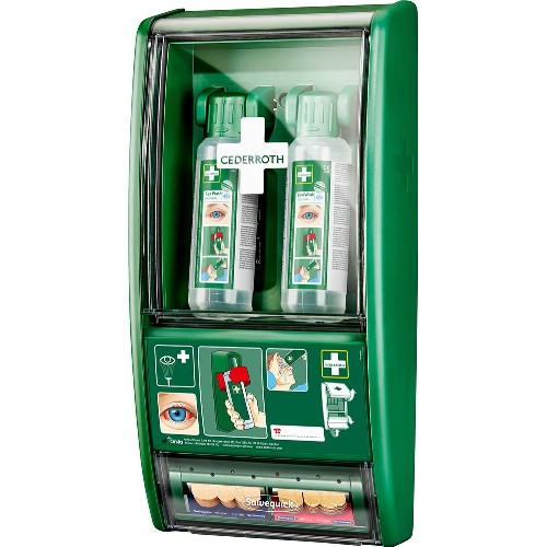 Stasjon med øyedusj som har vist seg å være mer effektiv enn saltvann for sprut fra alkalier og syrer. Øyedusjstasjonen er utformet slik at det er raskt å få hjelp. Inneholder 2 flasker som åpnes automatisk når de vris ut av holderne. Flaskene er utformet slik at øyet skylles med rikelig flyt i ca 1,5 minutt, øyekopp som garanterer optimal flyt. Bufret væske øker sjansen for å redde øynene. Virker for å nøytralisere øyets pH-verdi, det vil si at det virker nøytraliserende på sprut av alkalier og syrer, noe som gir raskere resultater enn en vanlig saltløsning. Effekten er generelt sterkere på alkalier enn syrer. 4,5 års holdbarhet. Flaskene kan ikke gjenbrukes. Stasjonen er også utstyrt med en lappedispenser. Plastrene trekkes nedover for å unngå tilsmussing eller blødning av andre plaster. Patch-påfyllingene er låst i maskinen for å sikre at de ikke blir borte. De tomme påfyllingene fjernes enkelt med en spesialnøkkel.
