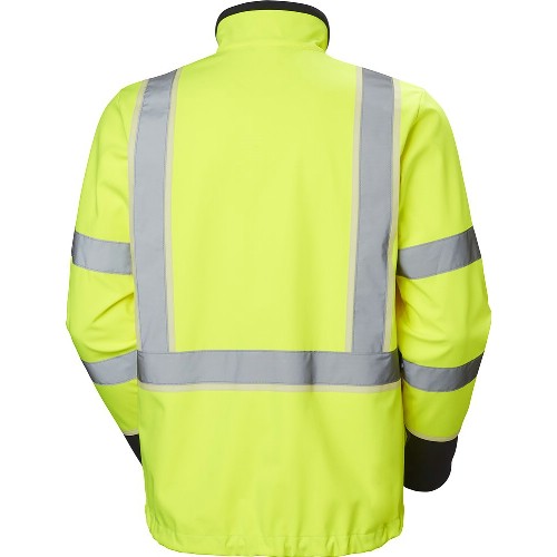 Jakke med høy synlighet i softshell-materiale med membran og vannavvisende behandling. YKK-glidelås foran med hakebeskyttelse. Børstet fleece på innsiden av kragen. Brystlomme og frontlommer med YKK-glidelås. Sløyfe for ID-kort. Justerbare mansjetter. Justerbar nederkant med snøring på innsiden av håndlommen. Amann-tråder. VizLite DT-striper som lyser i svakt eller intet lys. Vaskes på 40°C.