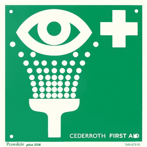 Opplyst advarselsskilt Øyedusj. Laget av hardplast som lyser i mørket etter lading i dagslys eller annen lyskilde. Dobbeltsidig for montering som flaggskilt eller opphenging i taket.